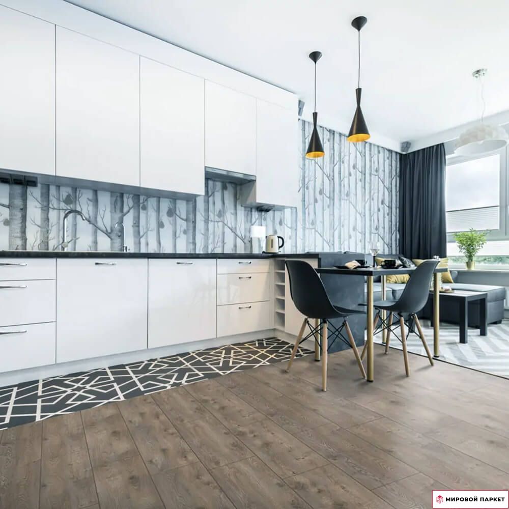 Водостойкость ламината обеспечивает надёжную защиту от влаги, что делает его подходящим для использования в кухнях и ванных комнатах. Антибактериальное покрытие и антистатические свойства добавляют ещё больше удобства в эксплуатации. Основой ламината служит высококачественная влагостойкая панель ХДФ (древесноволокнистая плита высокой плотности), обеспечивающая долговечность и стабильность формы покрытия. Материал экологичен и относится к классу E1, что гарантирует безопасность для здоровья.