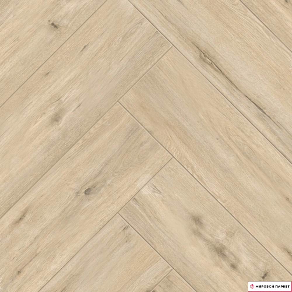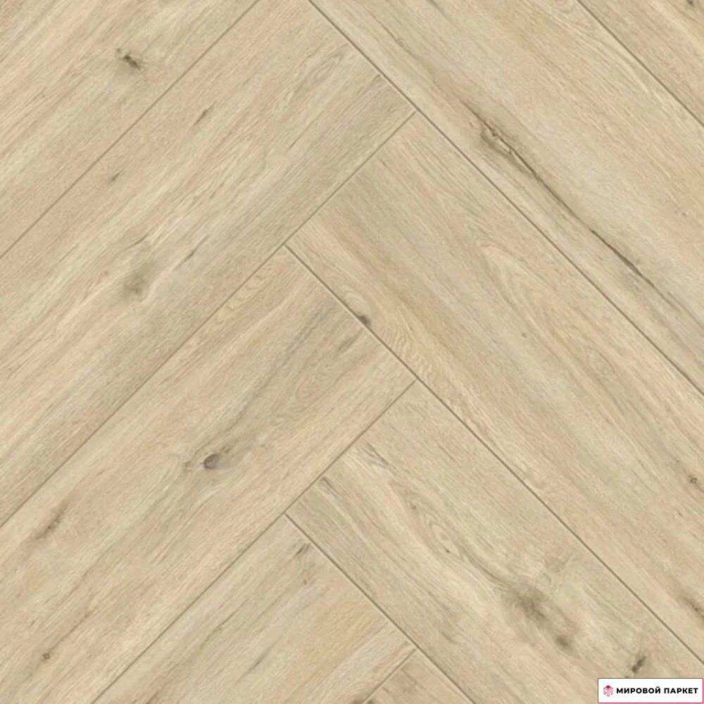 Дизайн покрытия «ёлочка» выглядит стильно и элегантно, создавая уютную атмосферу в помещении. Полуматовая поверхность и тиснение в регистр придают ламинату естественный вид. Цветовая гамма беж-коричневых оттенков идеально подойдёт для интерьера в натуральных тонах, имитируя древесину дуба. Кроме того, материал обладает антибактериальными и антистатическими свойствами, обеспечивая дополнительную гигиеничность и комфорт. Ламинат устойчив к царапинам и пятнам, что значительно облегчает уход за покрытием.