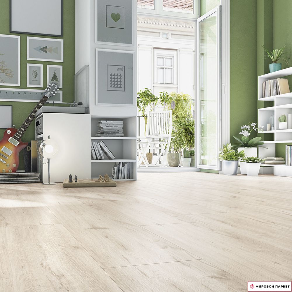 Ламинат имеет светлый бежевый оттенок с матовой поверхностью и текстурой, имитирующей древесину дуба. Такое покрытие придаст помещению уют и теплоту, а также создаст атмосферу природной гармонии. Внешний вид поверхности выполнен с тиснением в регистр, что делает ламинат ещё более реалистичным.