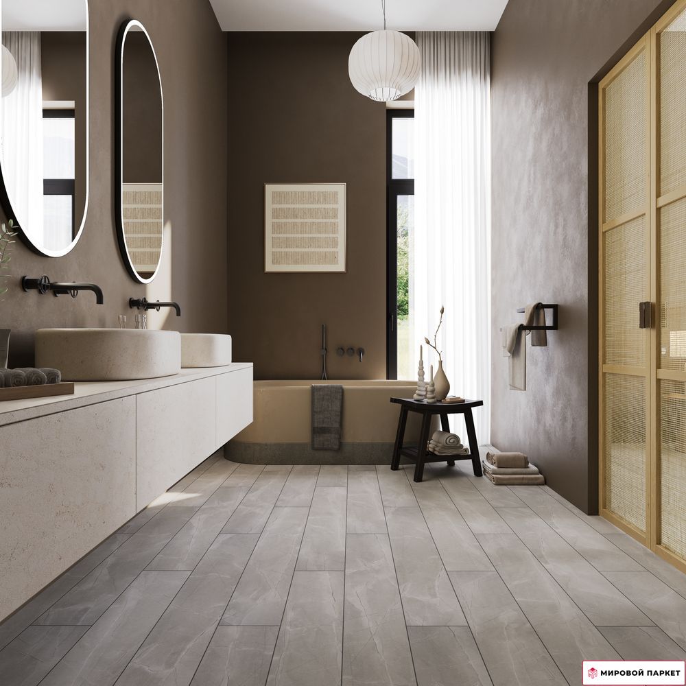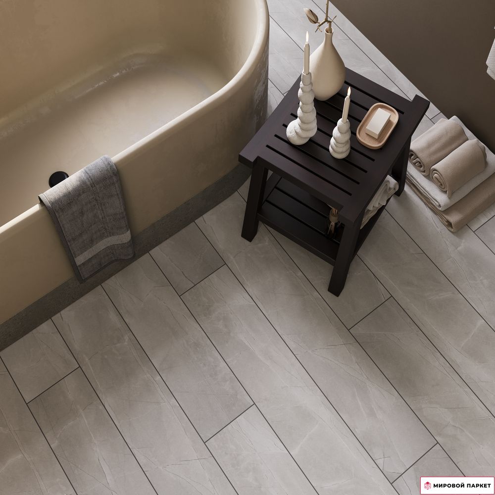Особая водостойкая структура материала обеспечивает надежную защиту от влаги, что значительно расширяет возможности его применения. Толщина 8 мм гарантирует дополнительную шумоизоляцию и приятные тактильные ощущения при ходьбе. Элегантная фаска по периметру каждой доски подчеркивает благородную текстуру светлого мрамора, создавая эффект натурального камня и визуально расширяя пространство.