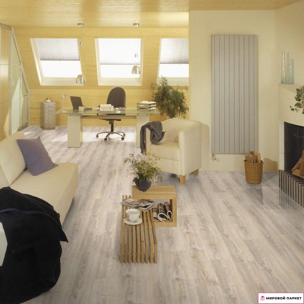 Оттенок ламината светлый бежевый, который визуально расширяет пространство и придаёт помещению теплоту и уют. Однополосный дизайн с полуматовой поверхностью и брашированием создаёт эффект натурального дерева, делая интерьер более природным и гармоничным. Такой ламинат хорошо подойдёт для стилей интерьера, где ценится естественная красота материалов.