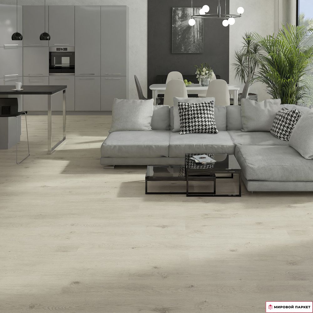 Толщина доски ламината составляет 8 мм, что является оптимальным показателем для домашнего использования. Ламинат имеет светлый серо-коричневый оттенок и трёхполосный дизайн, который визуально расширяет пространство. Поверхность полуматовая с синхронной текстурой, благодаря которой создаётся реалистичный эффект натурального дерева. Покрытие относится к 31 классу износостойкости (AC 3).
