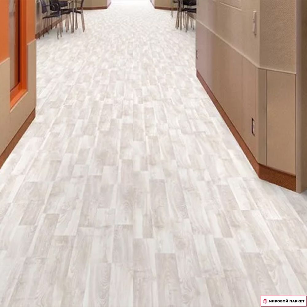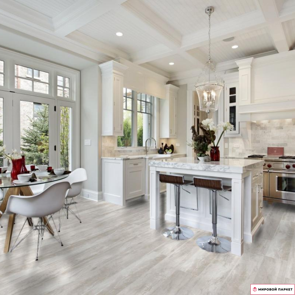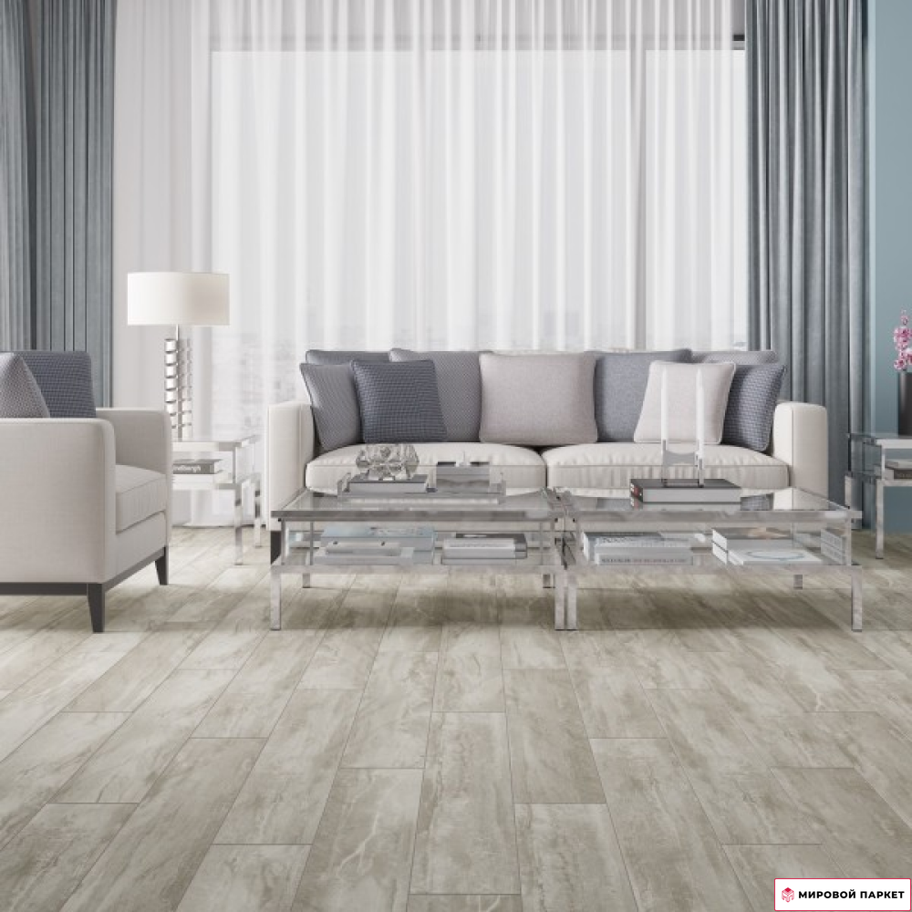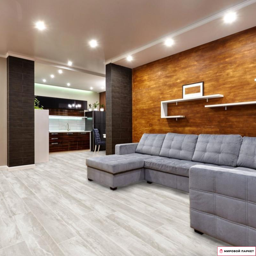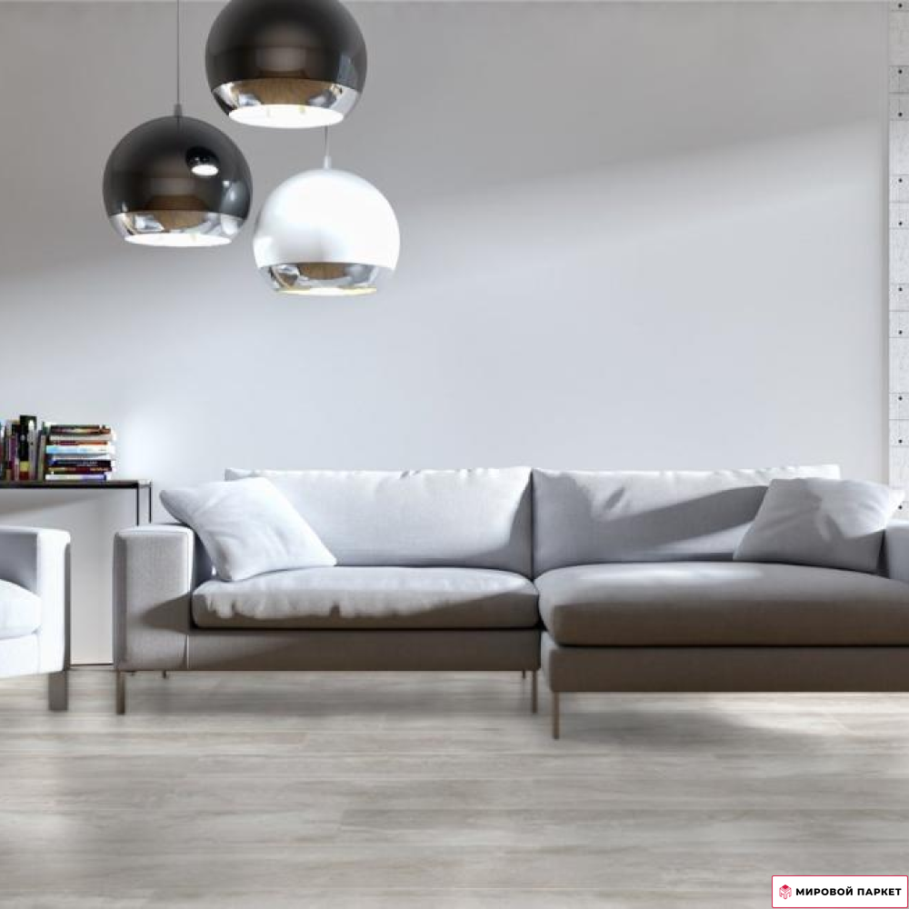 Покрытие относится к 32 классу использования и имеет толщину доски 8 мм. Благодаря матовой поверхности и однополосному дизайну, ламинат выглядит как натуральное дерево, создавая уютную атмосферу в помещении. Он выполнен в светлых серых тонах, что позволяет использовать его в интерьерах различных стилей. Особенностью этого ламината является наличие фасок по всем четырём сторонам, которые придают ему более выразительный и объёмный вид.