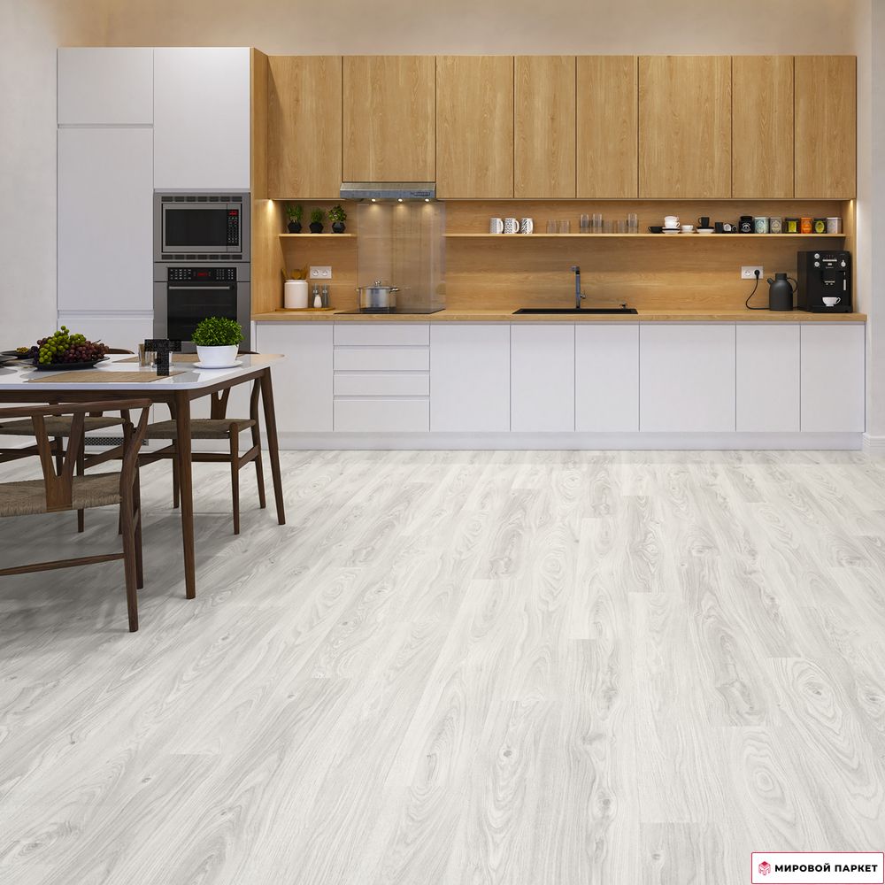 Ламинат имеет светлый оттенок и белый цвет, что позволяет ему гармонично сочетаться с различными стилями интерьера. Однополосный дизайн и полуматовая текстура поверхности создают эффект натуральной древесины, придавая помещению уют и теплоту. Благодаря рисунку древесины дуба и стандартному формату доски, ламинат легко вписывается в любое пространство. Он подходит для использования в гостиной, детской, кухне, на даче или в доме.