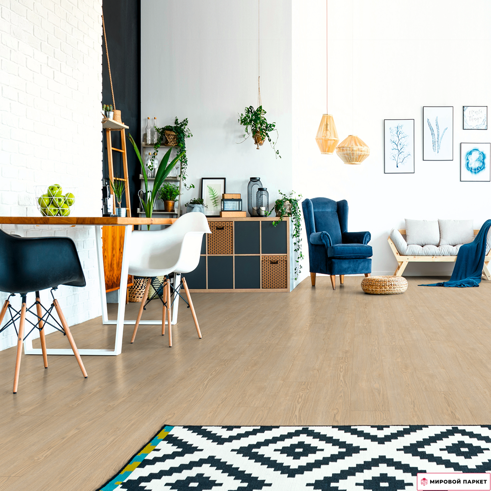 Материал, из которого изготовлен ламинат — ХДФ, плита высокой плотности. Основные преимущества этого покрытия — антибактериальная и антистатическая поверхности. Благодаря наличию фаски по четырём сторонам и формату широкой доски ламинат гармонично впишется в любой интерьер и поможет создать эффектный дизайн пола.