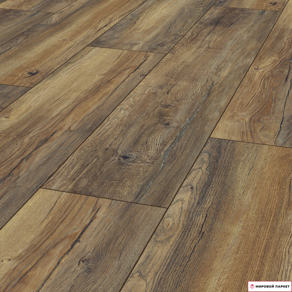 Толщина доски ламината составляет 8 мм, что обеспечивает достаточную прочность и стабильность покрытия. Дизайн выполнен в однополосном варианте, имитирующем древесину дуба. Внешний вид поверхности — полуматовый, а текстура поверхности — синхронная, благодаря чему ламинат выглядит как настоящее дерево.