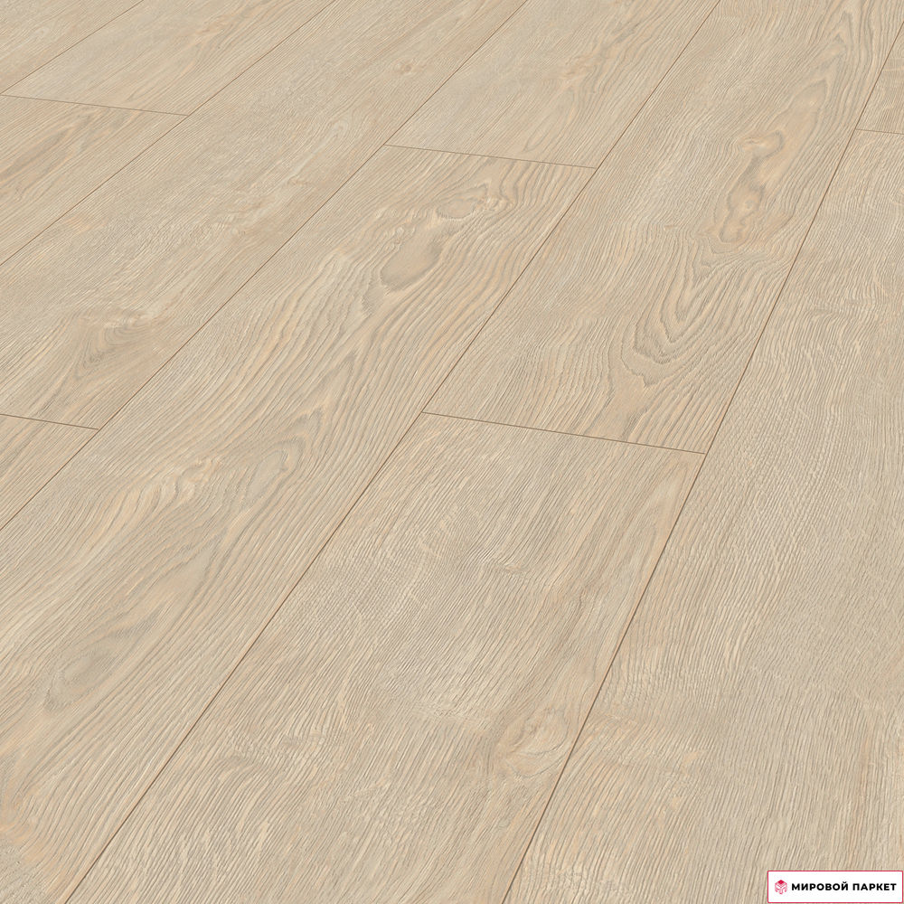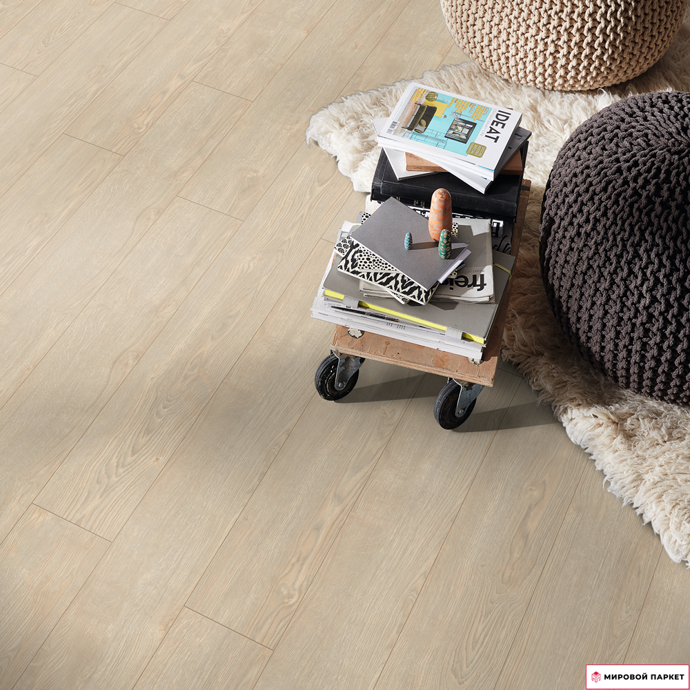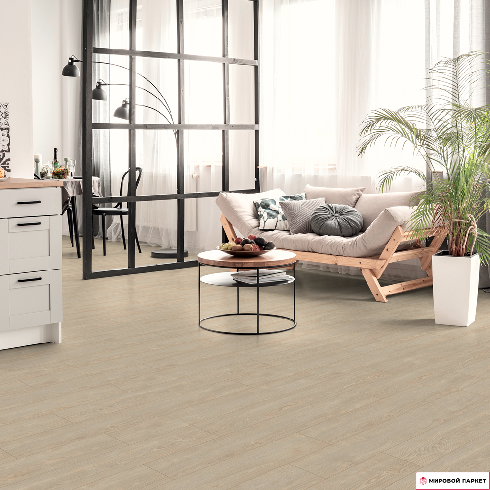 Светлый оттенок и бежевый цвет этого ламината создают уютную и тёплую атмосферу в помещении, делая его визуально более просторным и светлым. Порода дерева — дуб, который издавна ценится за свою прочность и элегантность. Однополосный дизайн с полуматовой поверхностью придаёт ламинату естественный и натуральный вид. Синхронная текстура поверхности точно повторяет рисунок древесины, создавая ощущение настоящего деревянного пола. Наличие фаски по четырём сторонам каждой доски делает ламинат ещё более похожим на паркет, придавая ему дополнительную элегантность и изысканность. Стандартный формат доски облегчает укладку и позволяет быстро и легко обновить интерьер помещения.
