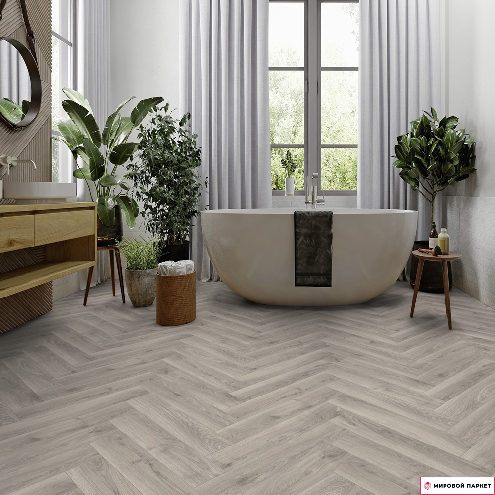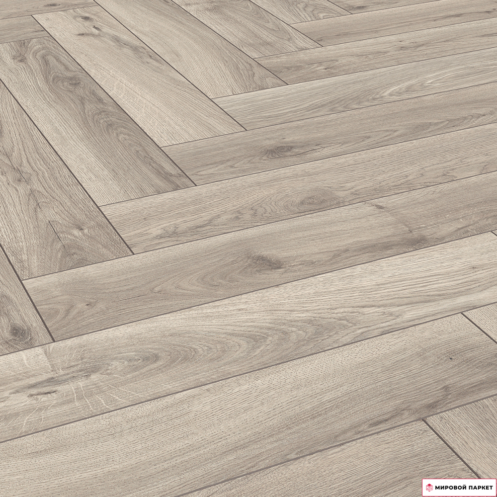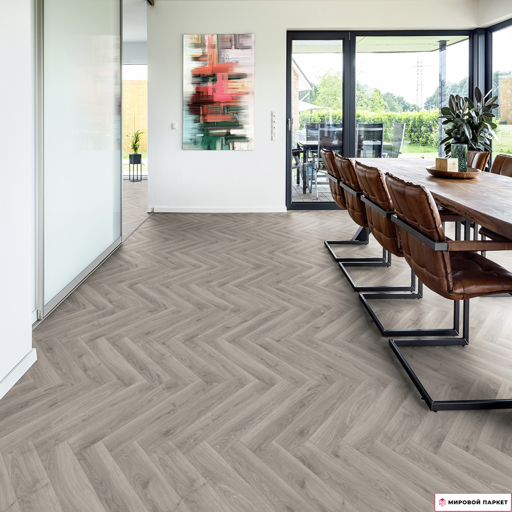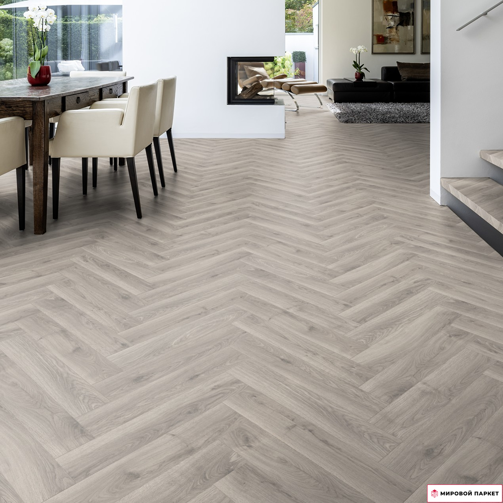 Ламинат Terhurne Herringbone Edition Английская ёлка Дуб Ательер — это высококачественное напольное покрытие, которое сочетает в себе прочность, долговечность и эстетическую привлекательность.