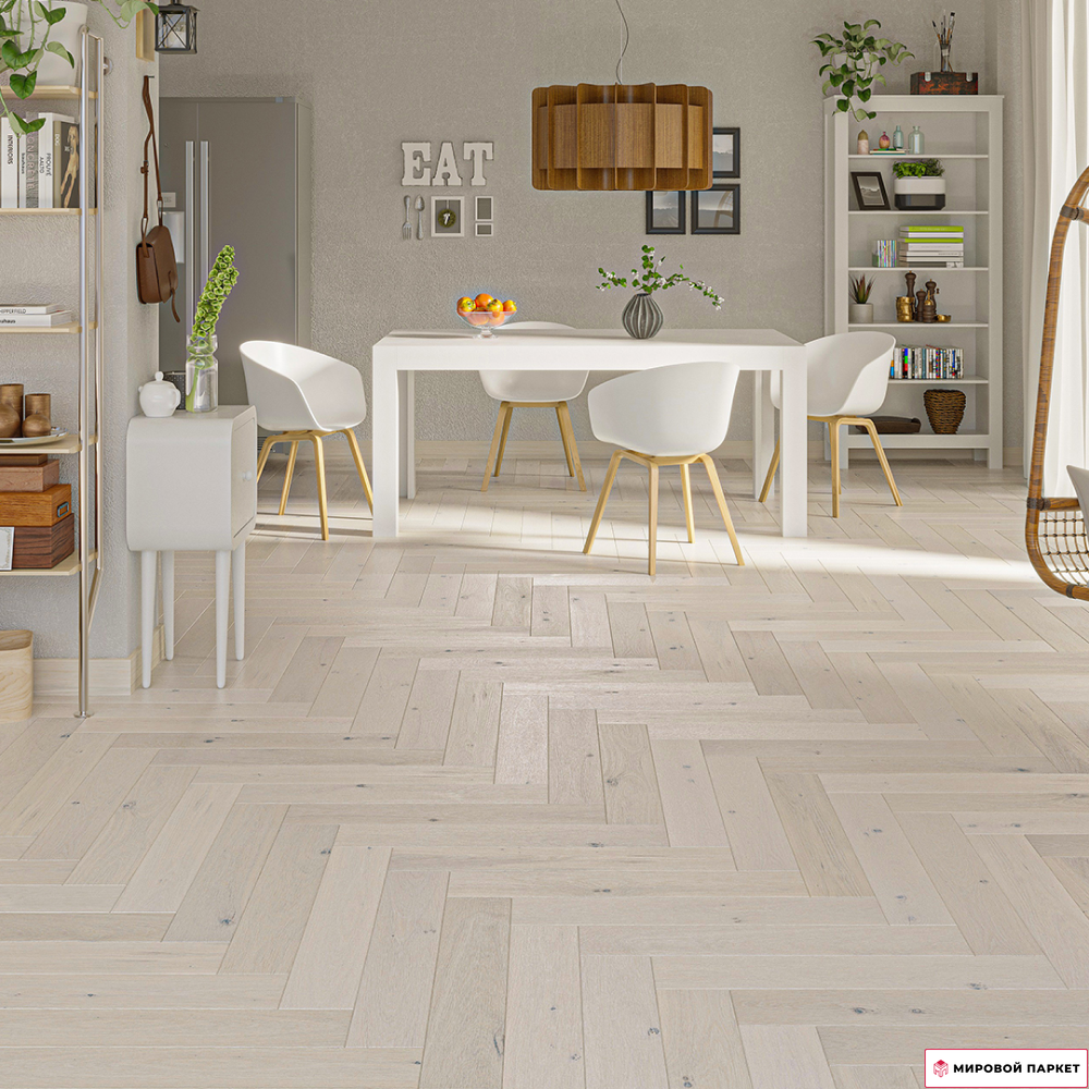Формат венгерской елочки позволяет создать на полу интересный и оригинальный узор, который добавит интерьеру индивидуальности и уникальности. Мелкий размер каждой доски делает укладку пола быстрой и легкой. Благодаря своей толщине в 14 мм пол будет обладать хорошей звукоизоляцией, а также сохранит тепло в помещении.