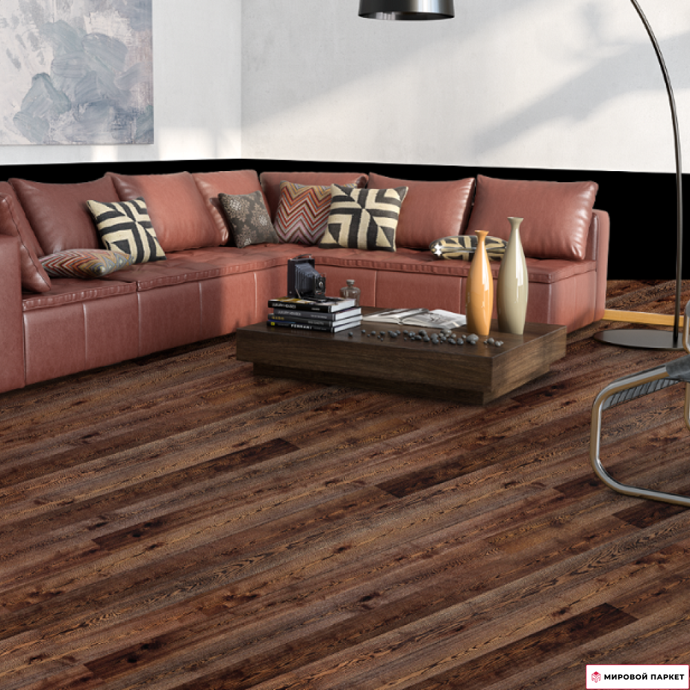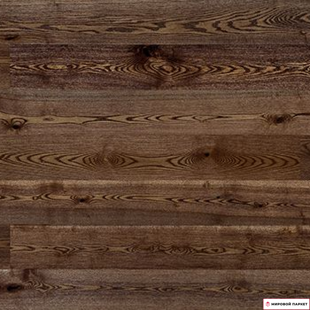 Цвет доски - темно-коричневый, что создает уютную атмосферу в помещении. Покрытие выполнено полуматовым лаком, который не только защищает древесину от внешних воздействий, но и добавляет ей блеск. Структура древесины подчеркивается технологией браширования, которая заключается в удалении мягких волокон древесины для создания рельефа. Это делает поверхность доски более глубокой и объемной, а также улучшает ее внешний вид.