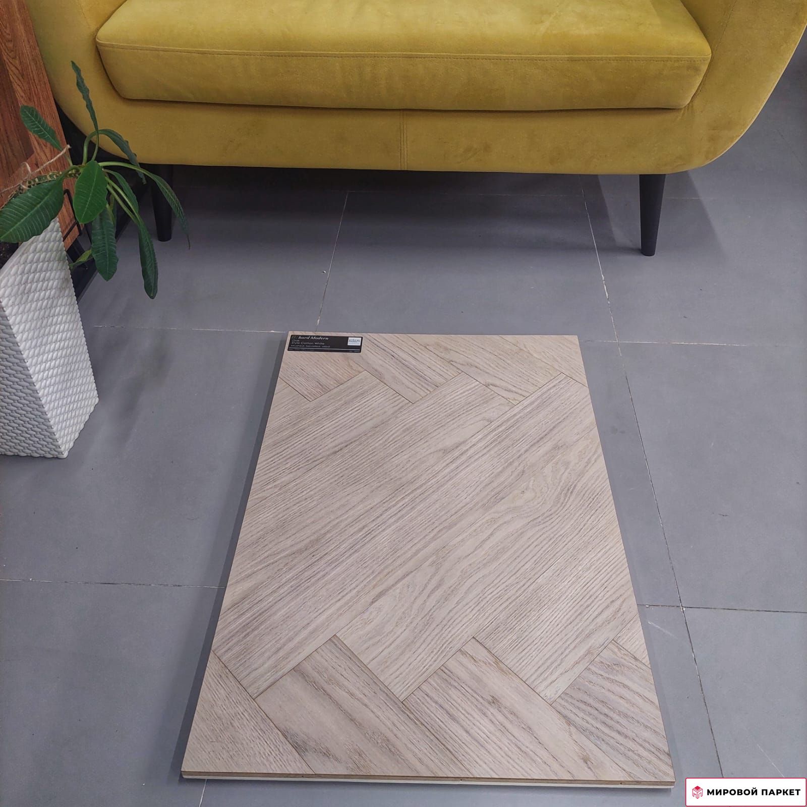 Дизайн: Укладка в формате "елочка" с ярко выраженной текстурой дуба создает эффект классического паркета, добавляя помещению уюта и изысканности.
