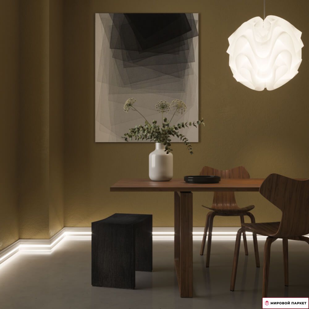- Установка Плинтуса с подсветкой позволяет эффективно использовать пространство, подчёркивая идеальную геометрию помещения и создавая чёткие линии, корректирующие внутреннее пространство. Светодиодная подсветка обеспечивает формирование достаточно глубокого, равномерного и мягкого светового потока.